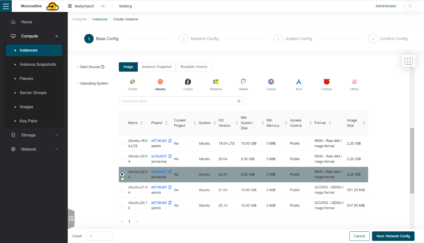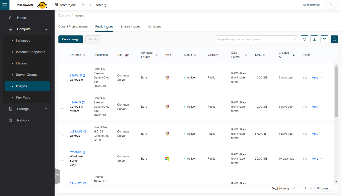 Выбрав пункт Images -> Public Images, можно ознакомиться с доступными образами для создания виртуальной машины.