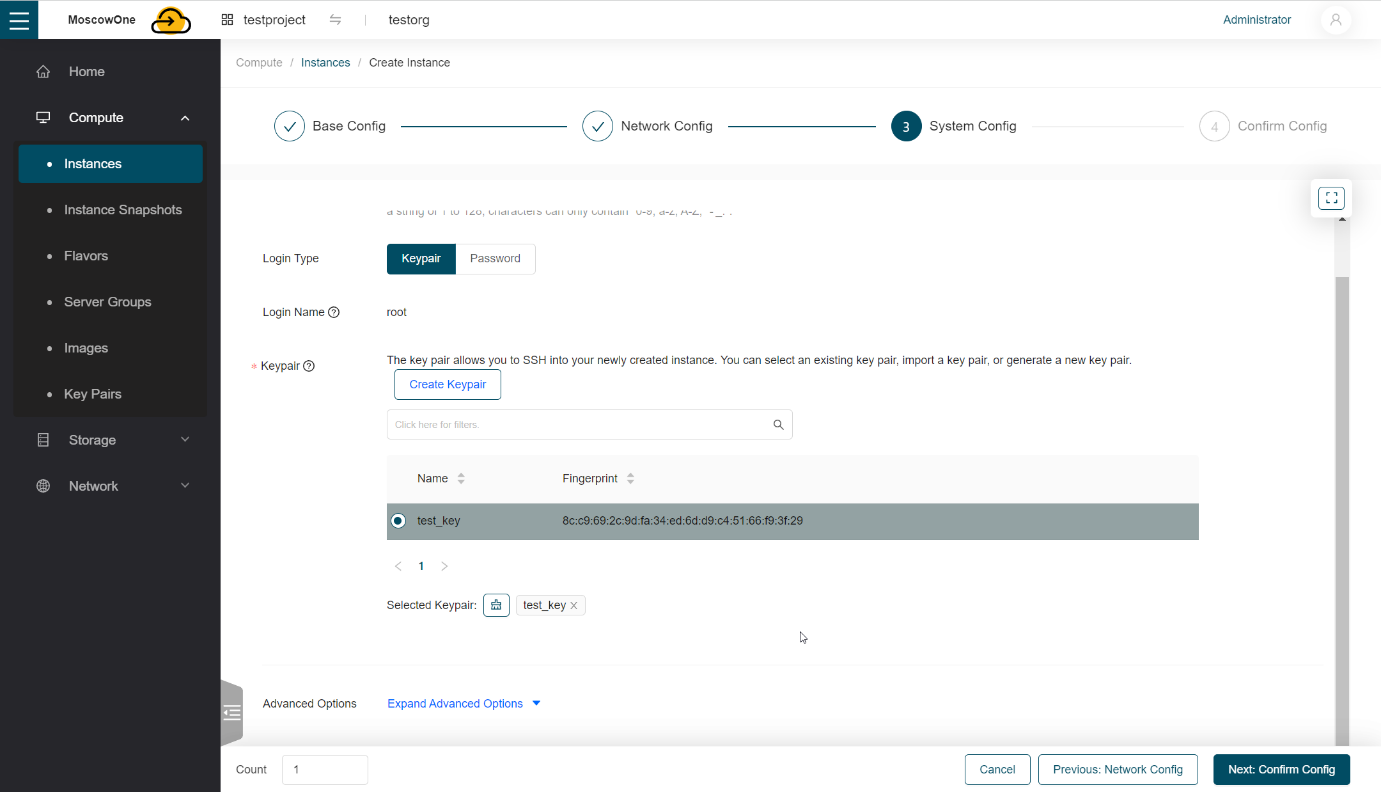 Создать или подгрузить SSH ключ в панель управления виртуальными машинами можно так же заранее, в разделе Compute -> Key Pairs, по такому же алгоритму.