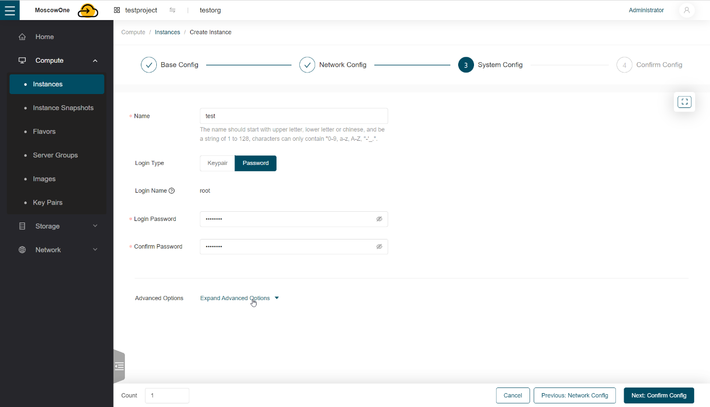 В разделе Login Type выбираем как будет осуществляться доступ к виртуальной машине, по SSH (Keypair) или по паролю (Password)