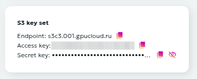 This section displays the parameters required to connect to the storage’s S3 interface:
